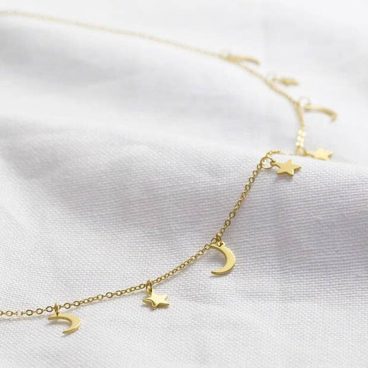Gold Stainless Steel Star and Moon Charm Necklace