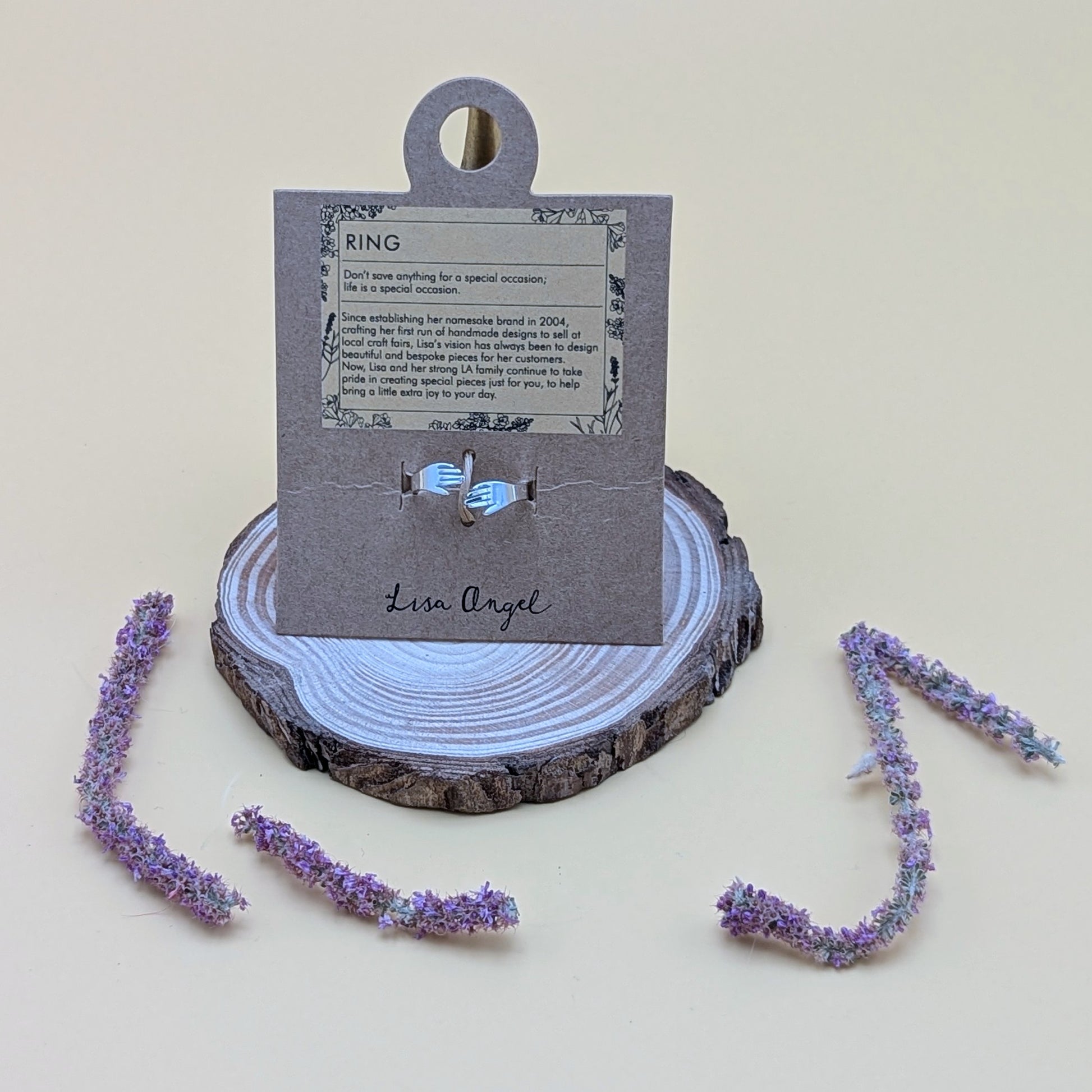 Adjustable in size Formed of a curved band with tiny hands on each end to create a hugging effect when worn on your finger.