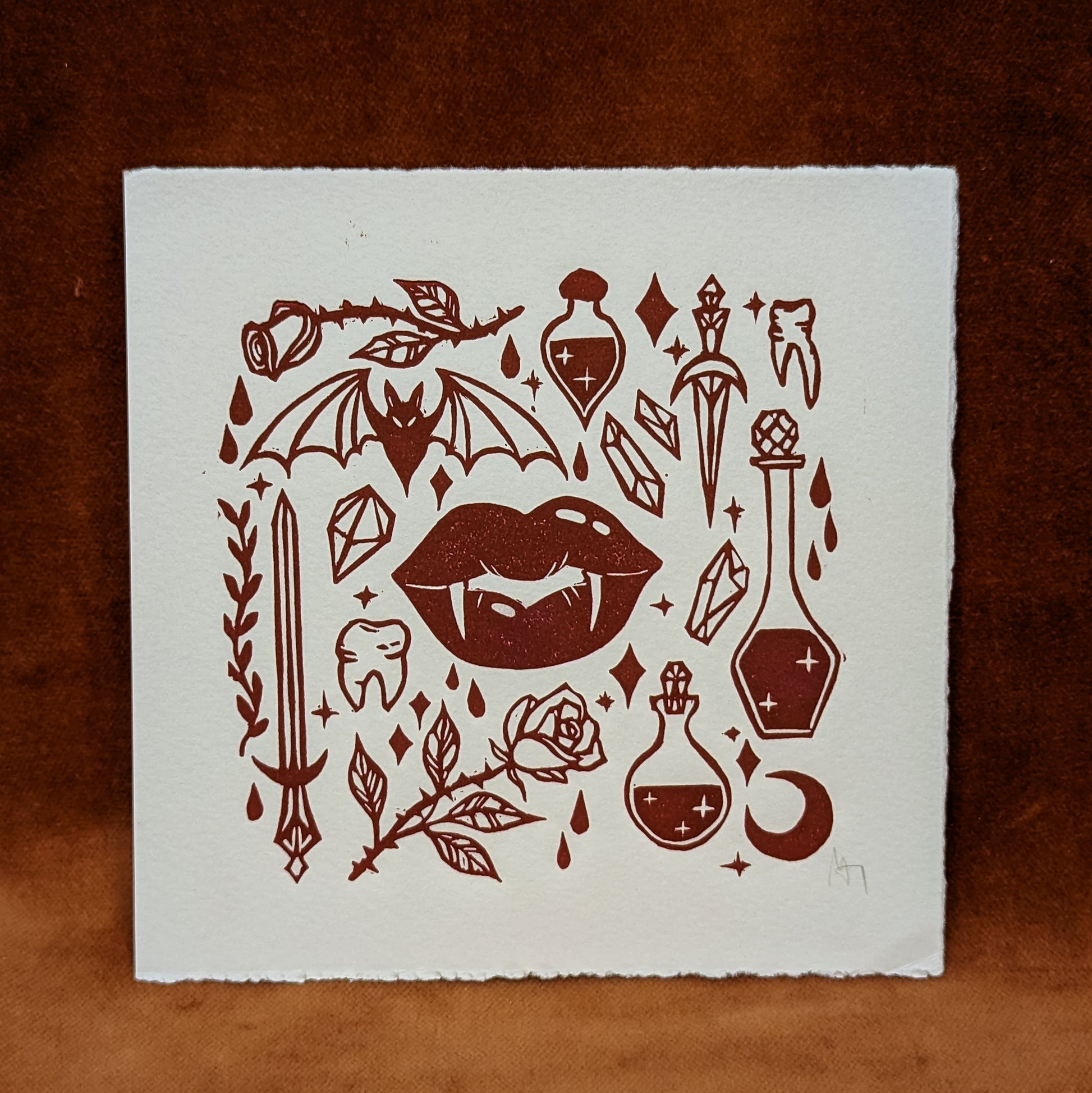 This linocut print by Strange Meadows brings together the spooky vibe of a vampiric witch, complete with bas, spell bottles, and voluptuous red fanged lips!