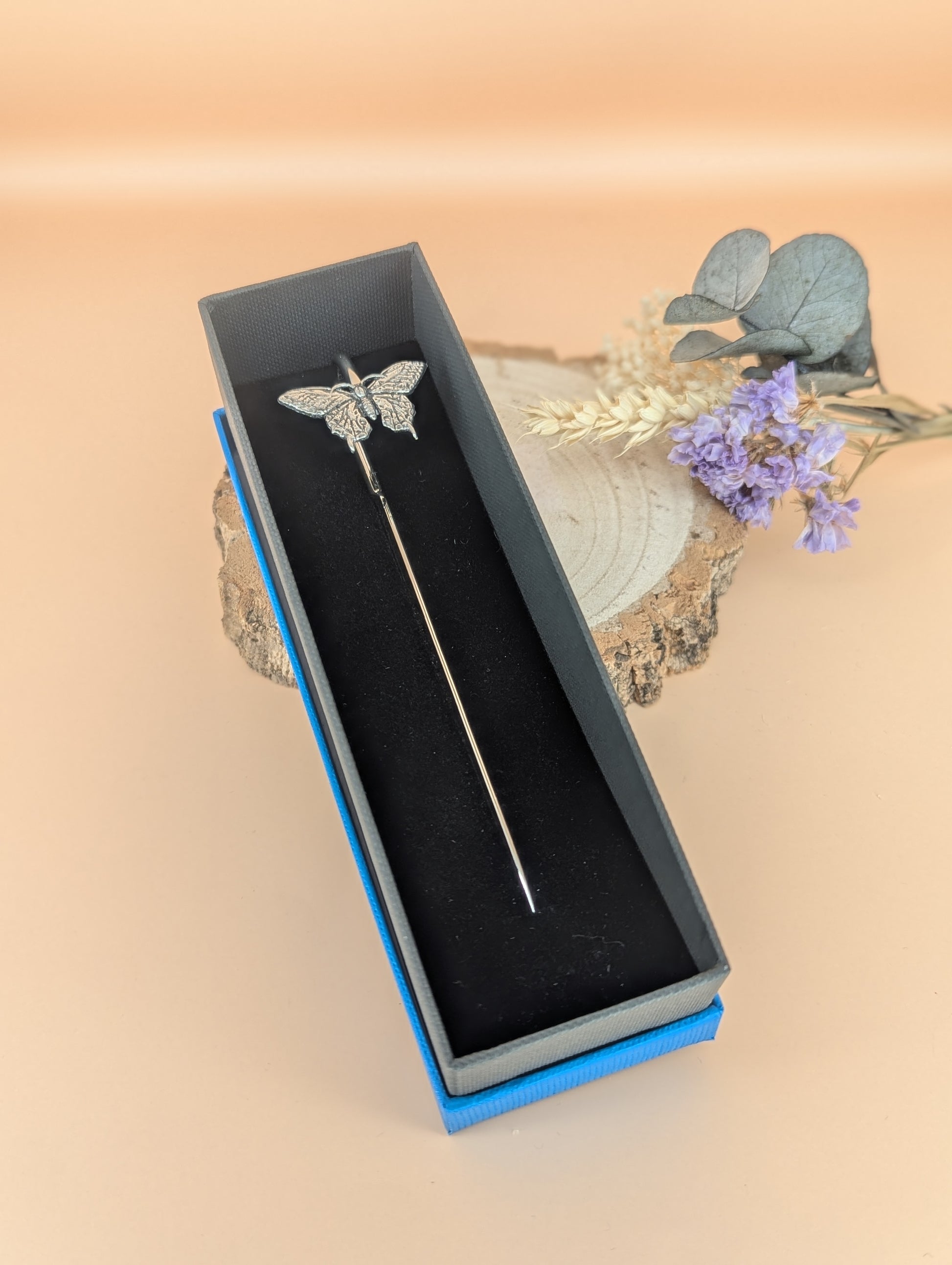 Our beautifully detailed Butterfly Bookmark features a flattened stem that enables a page to be marked without risk of damaging the book. The motif is then elegantly presented on the spine of the book, and the book can be put back on the book shelf with the mark in place. Supplied complete with an attractive lidded box.
