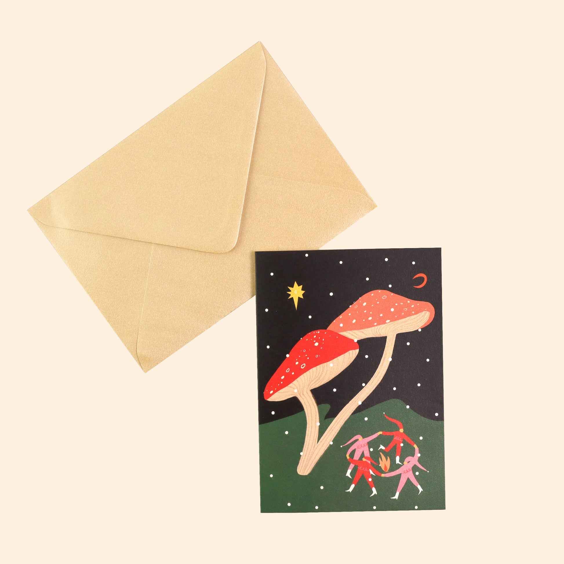 Description from Little Black Cat: "A unique folky Christmas card, featuring elves dancing around a fire under a pair of giant mushrooms, against a snowy woodland landscape. A bright star and crescent moon hang in the sky.