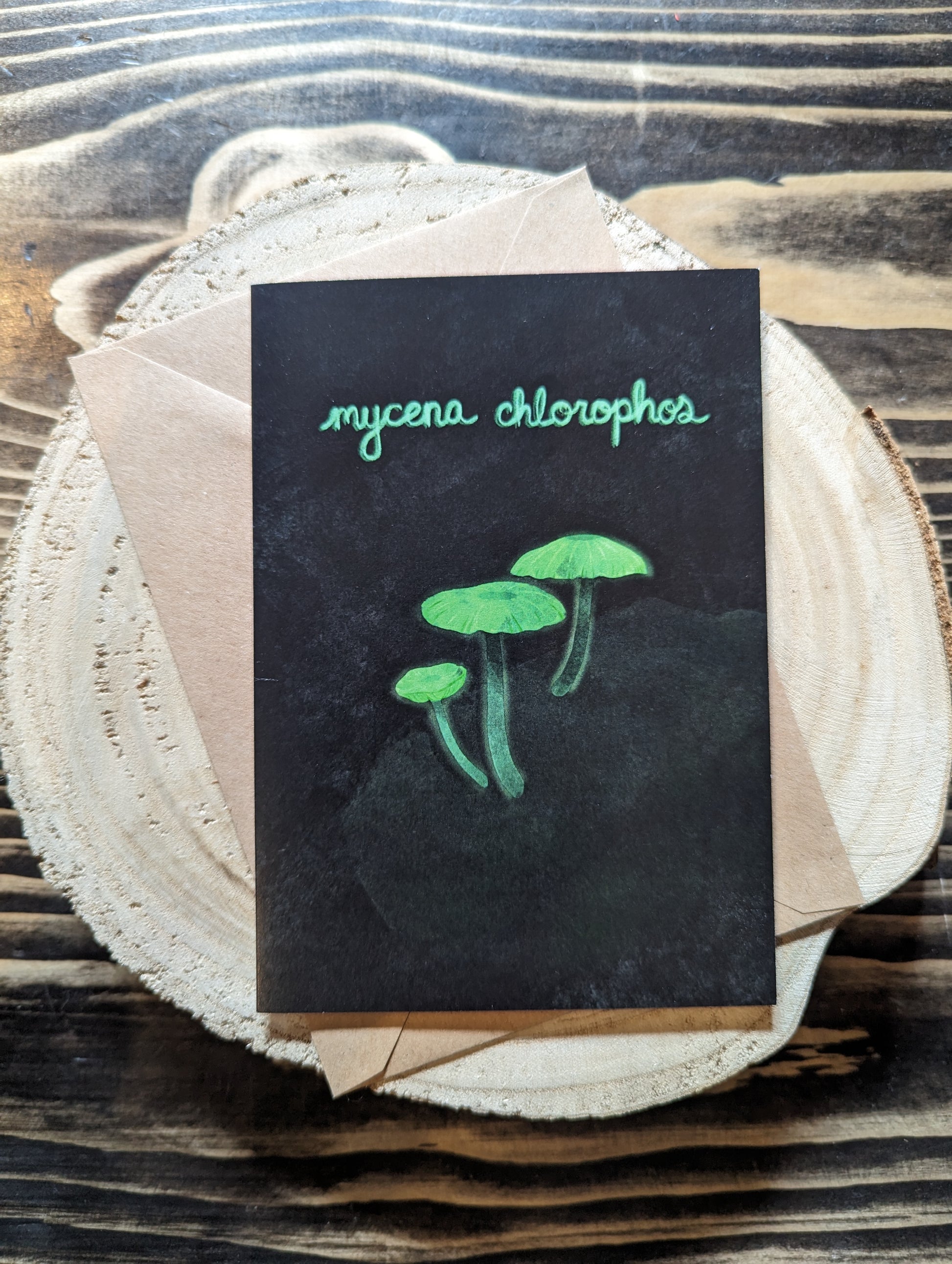 ‘Mycena Clorophos’ mushroom glow greeting card by Siobhan Duncan