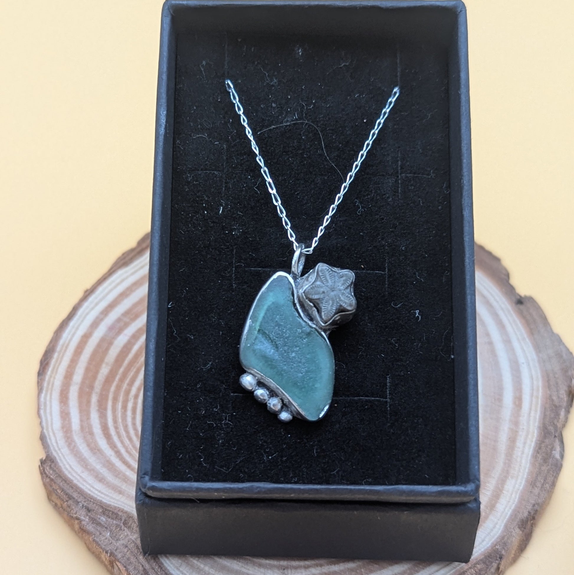 A unique recycled silver pendant, holding turquoise sea glass found along the coast of Scotland and a beautiful crinoid fossil.