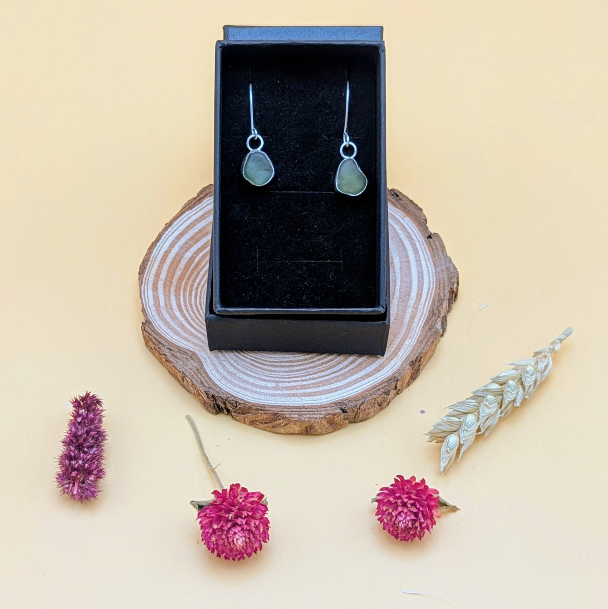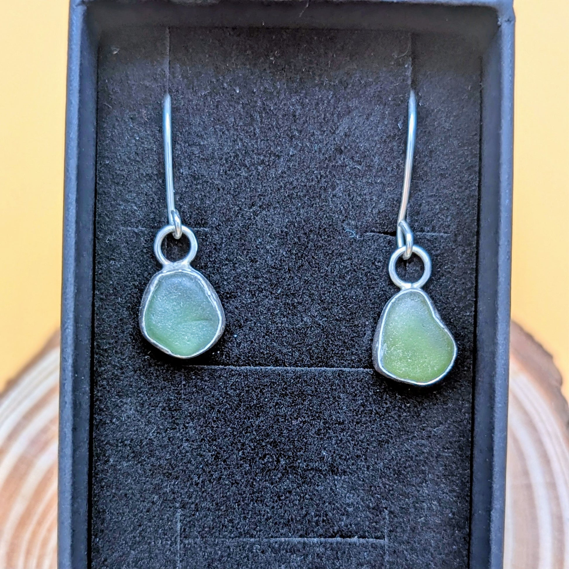 Green sea glass found along the coast of Scotland and set into recycled sterling silver dangling earrings.