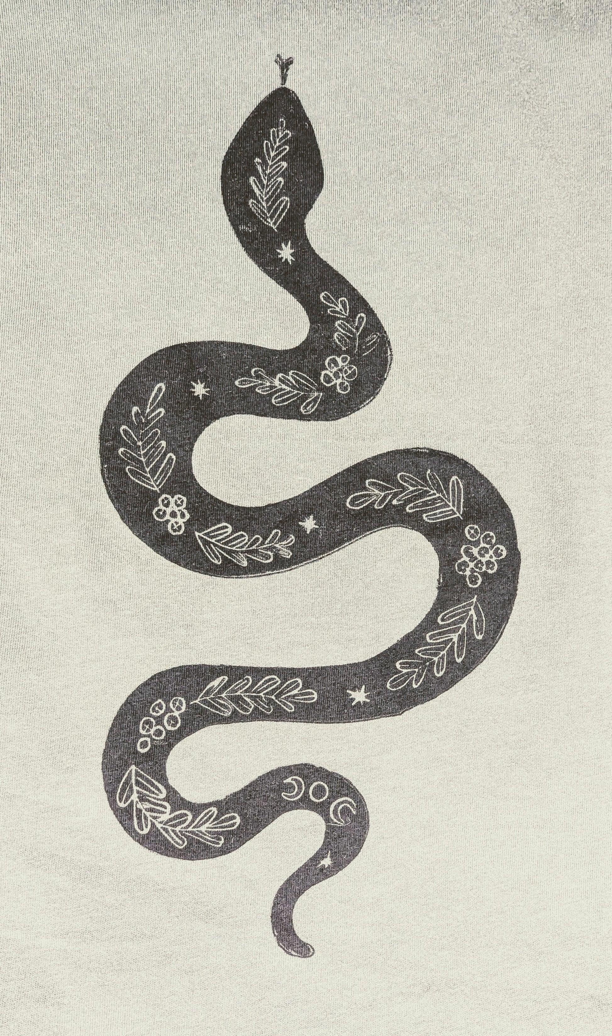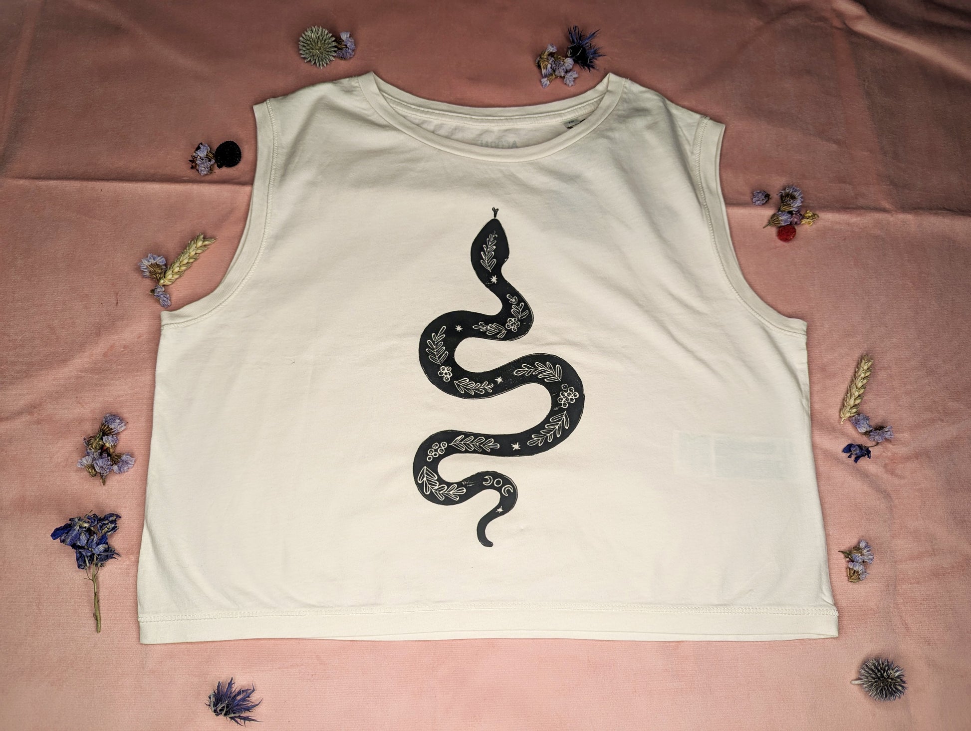 From Acorn Prints Studios: these super soft organic cotton sleeveless tee-shirts feature a hand printed snake bedecked with moon and floral detailing. Tees available in soft muted green, red or blue. Fit is cropped and boxy, but most find it fits true to size.