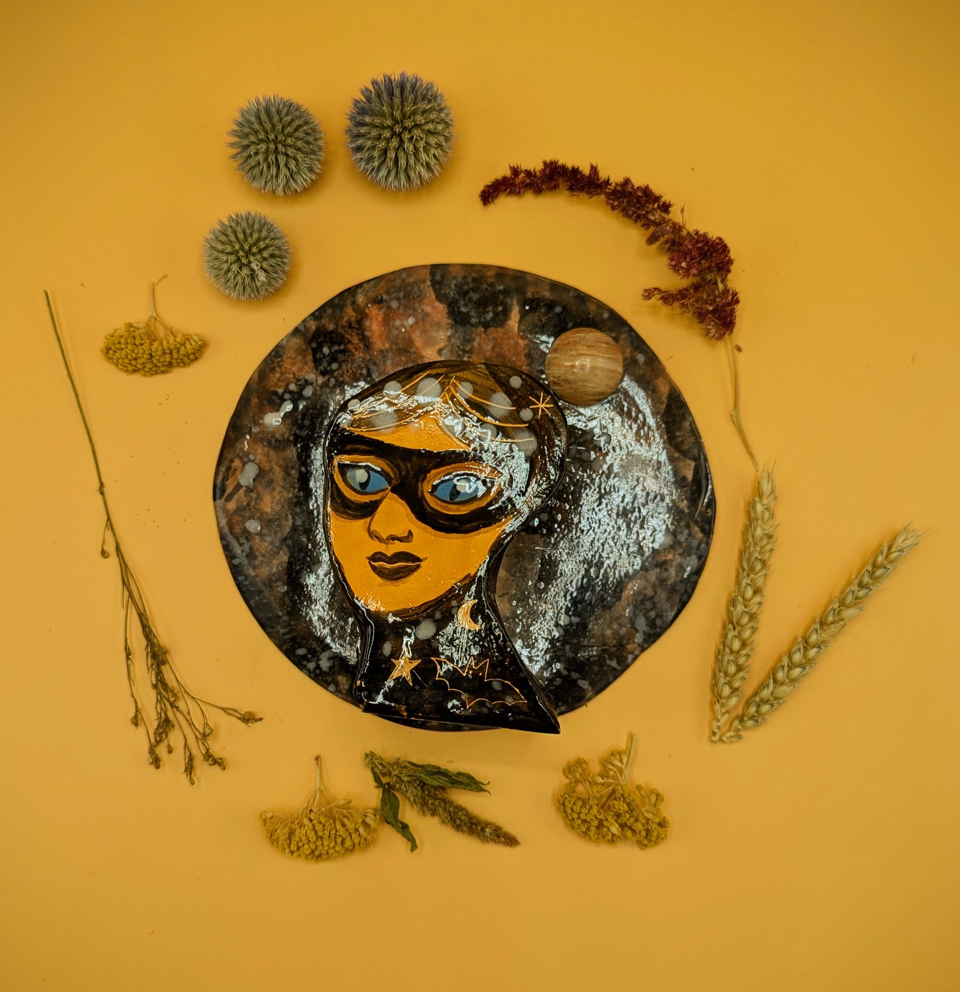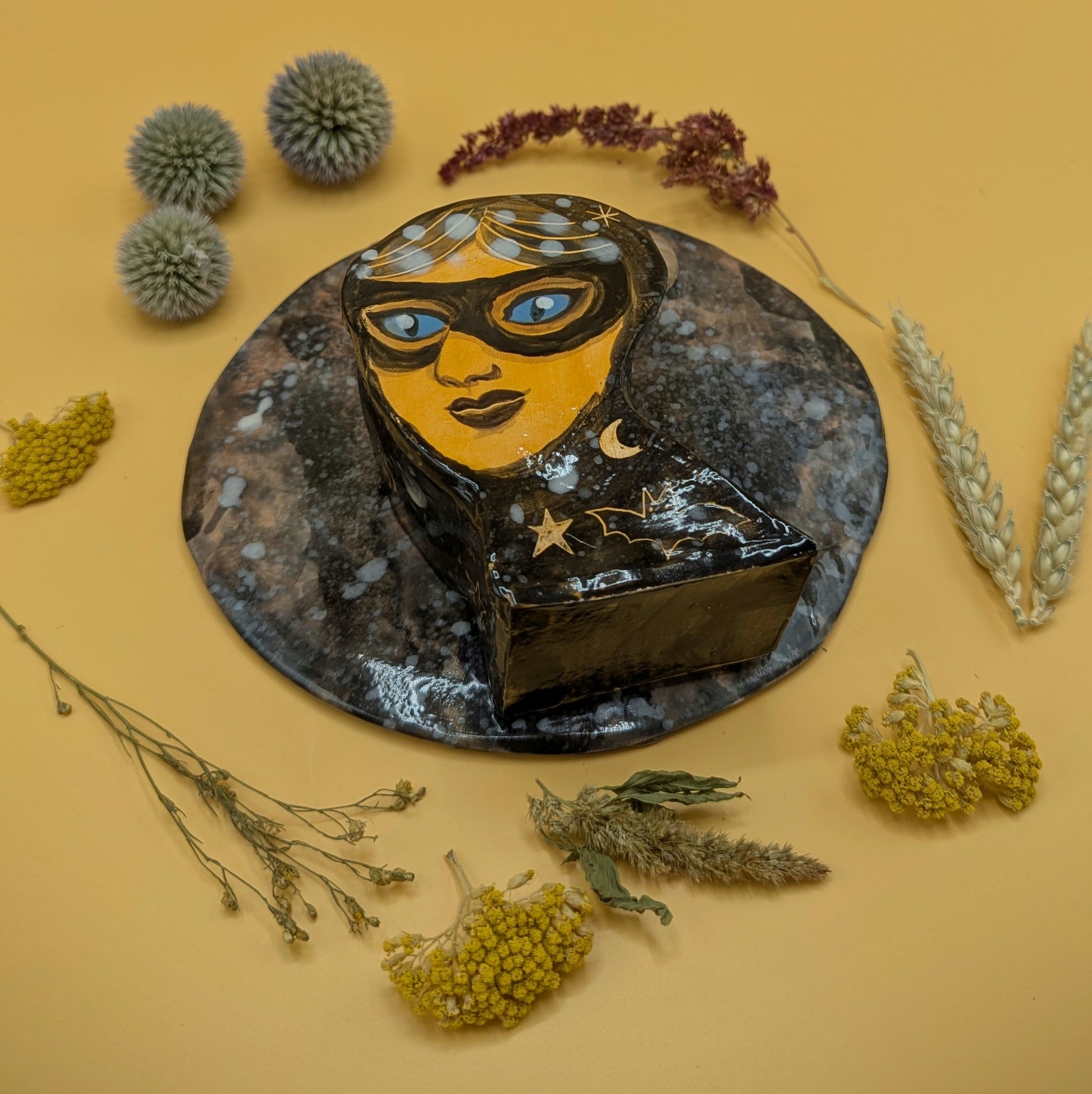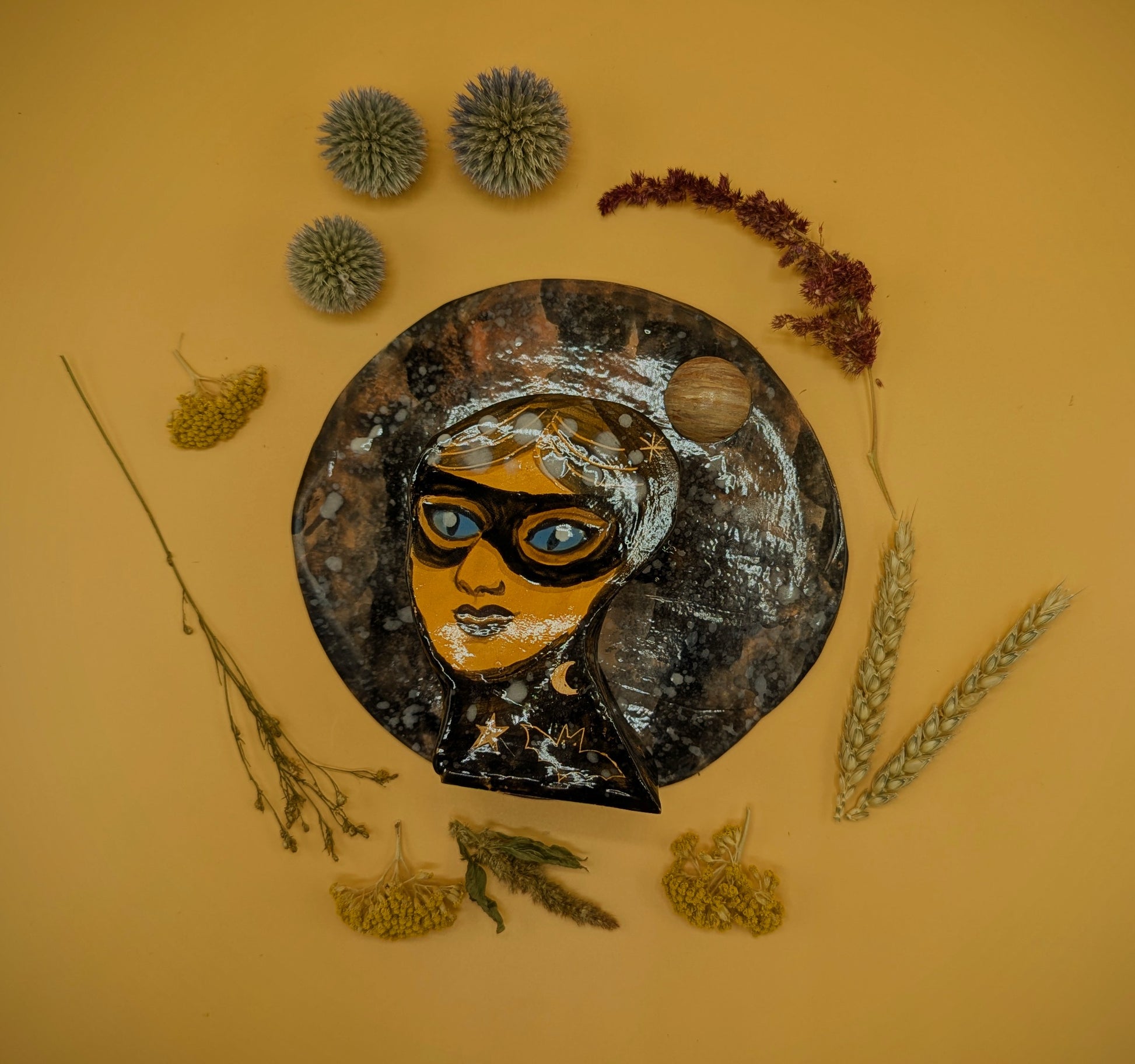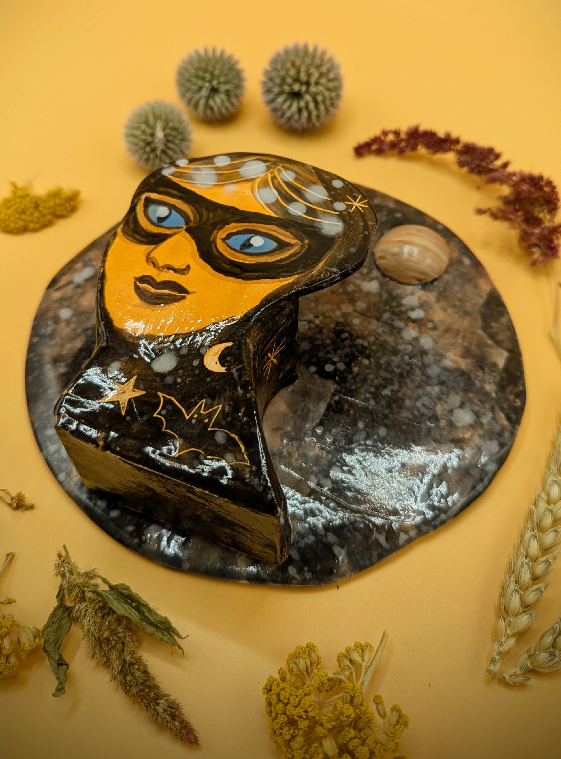 Wall sconce vase featuring masked Hecate on a cosmic violet background with planet.