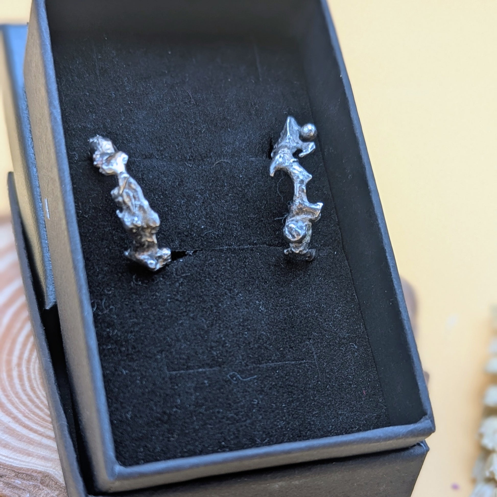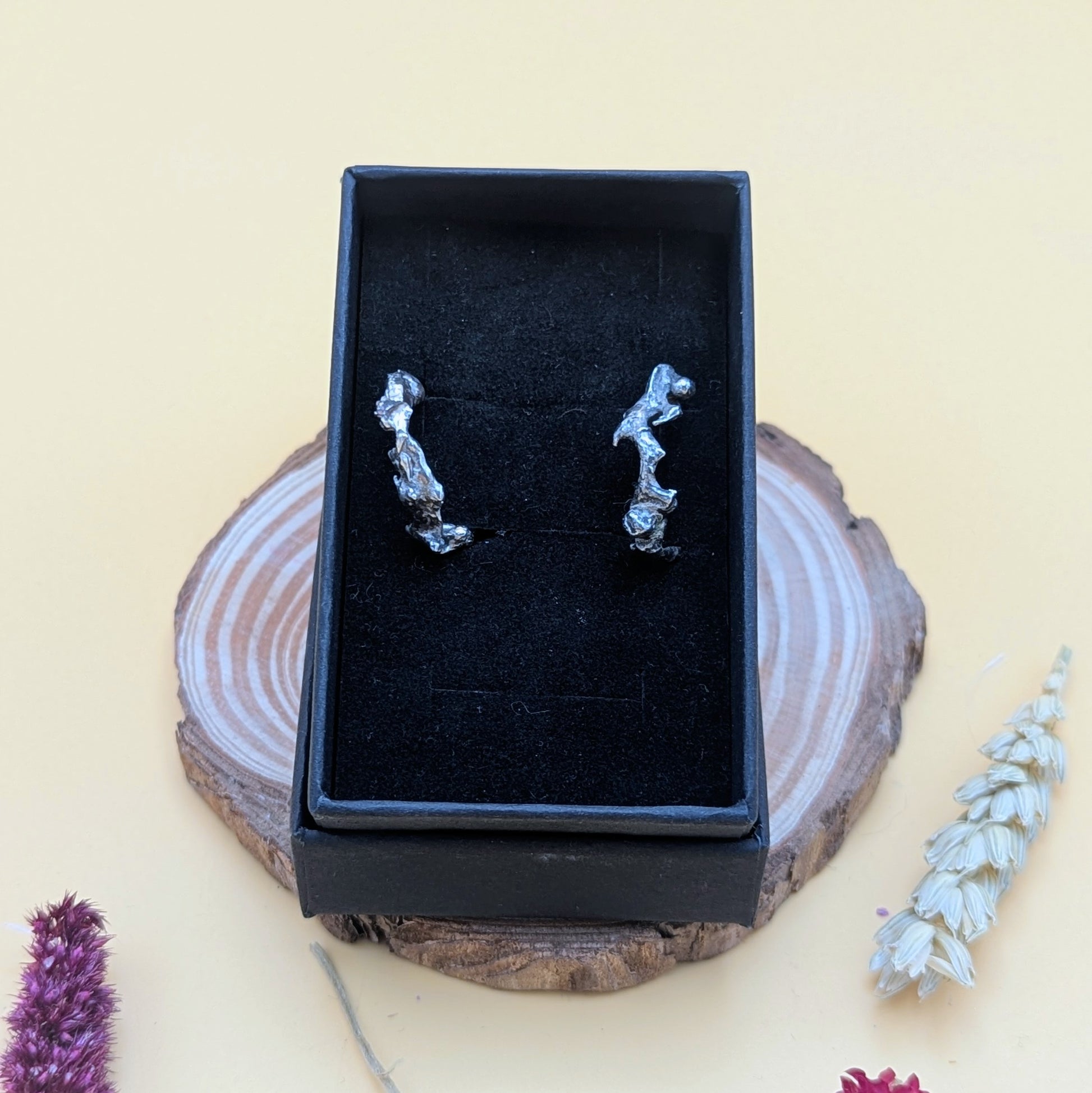 A pair of half hoop, branch-like sterling silver earrings. These earrings are made by melting recycled bits of silver, allowing the metal to flow and follow the heat. The design takes form organically and each earring is entirely unique.