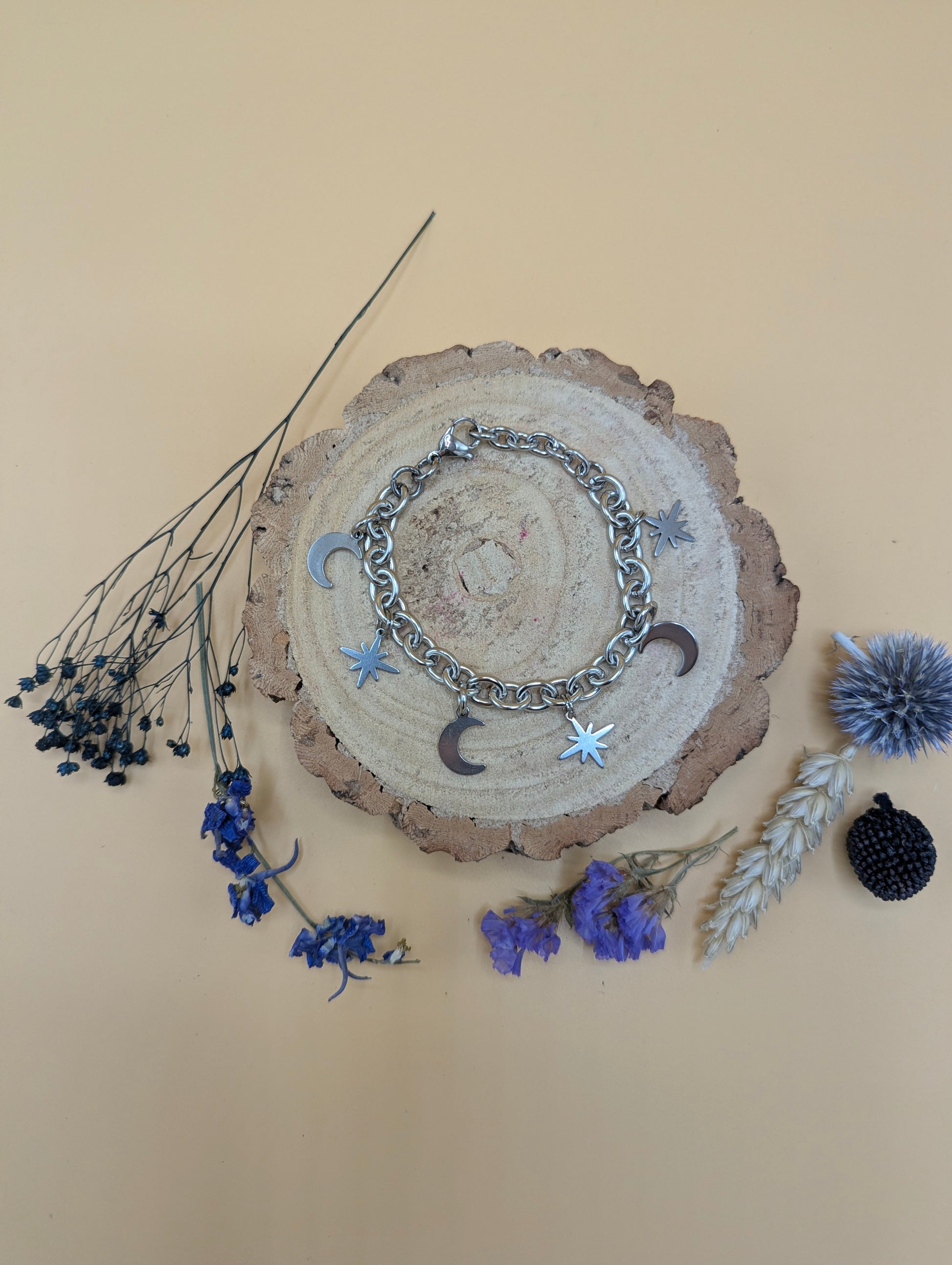 "This night charm themed bracelet features a rounded curb chain with moon and star charms dangling loosely. With a lobster clasp and a full stainless steel construction this bracelet will be there for you for many nights to come.