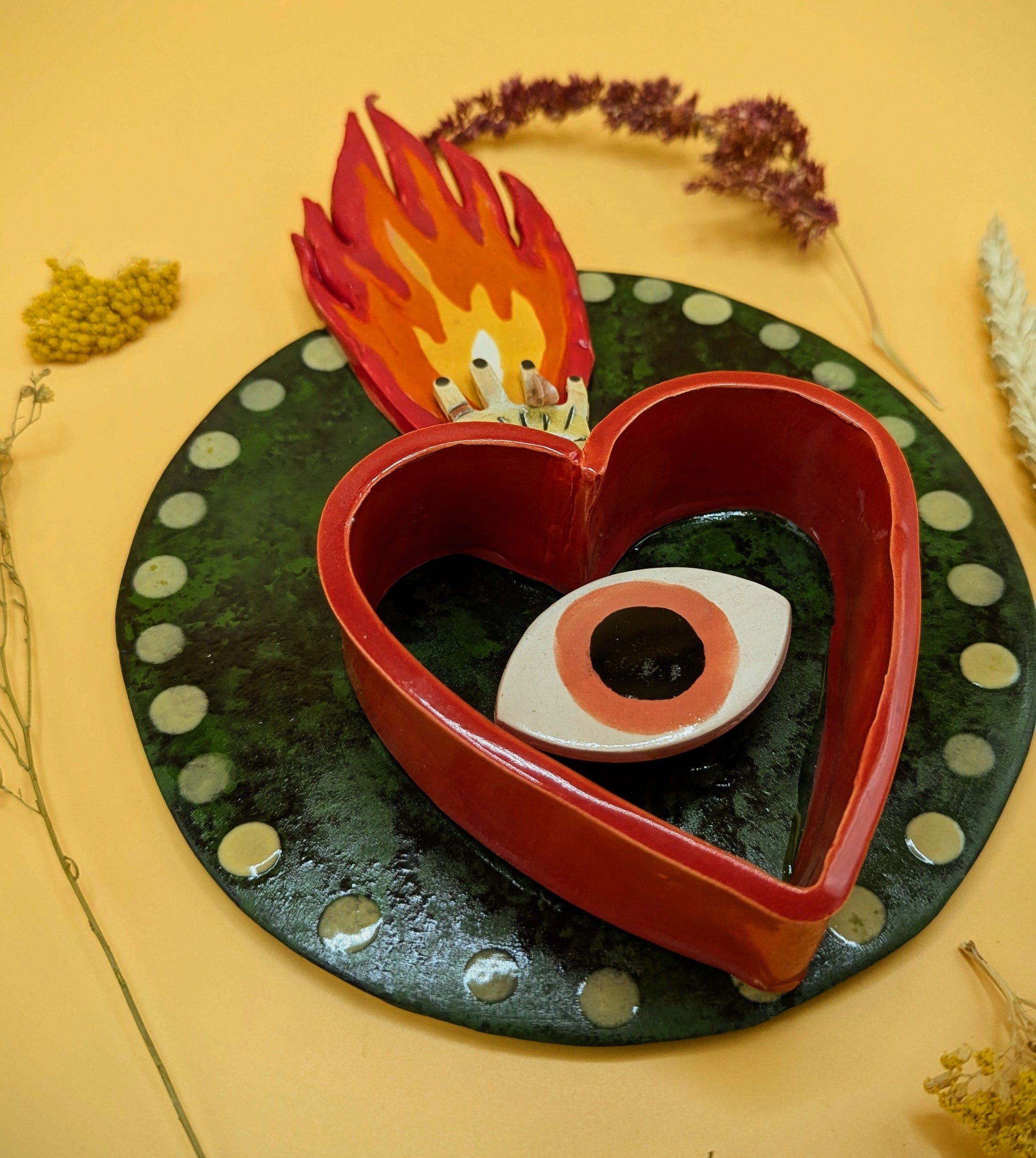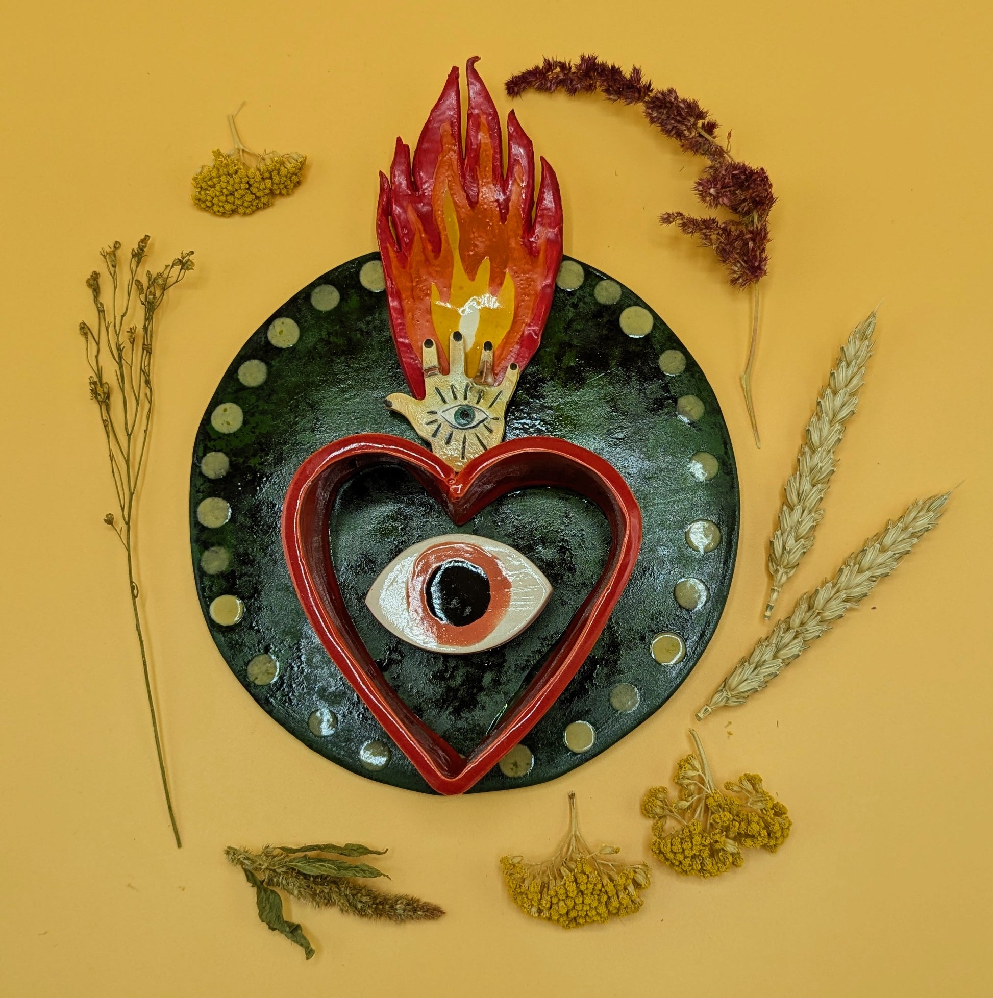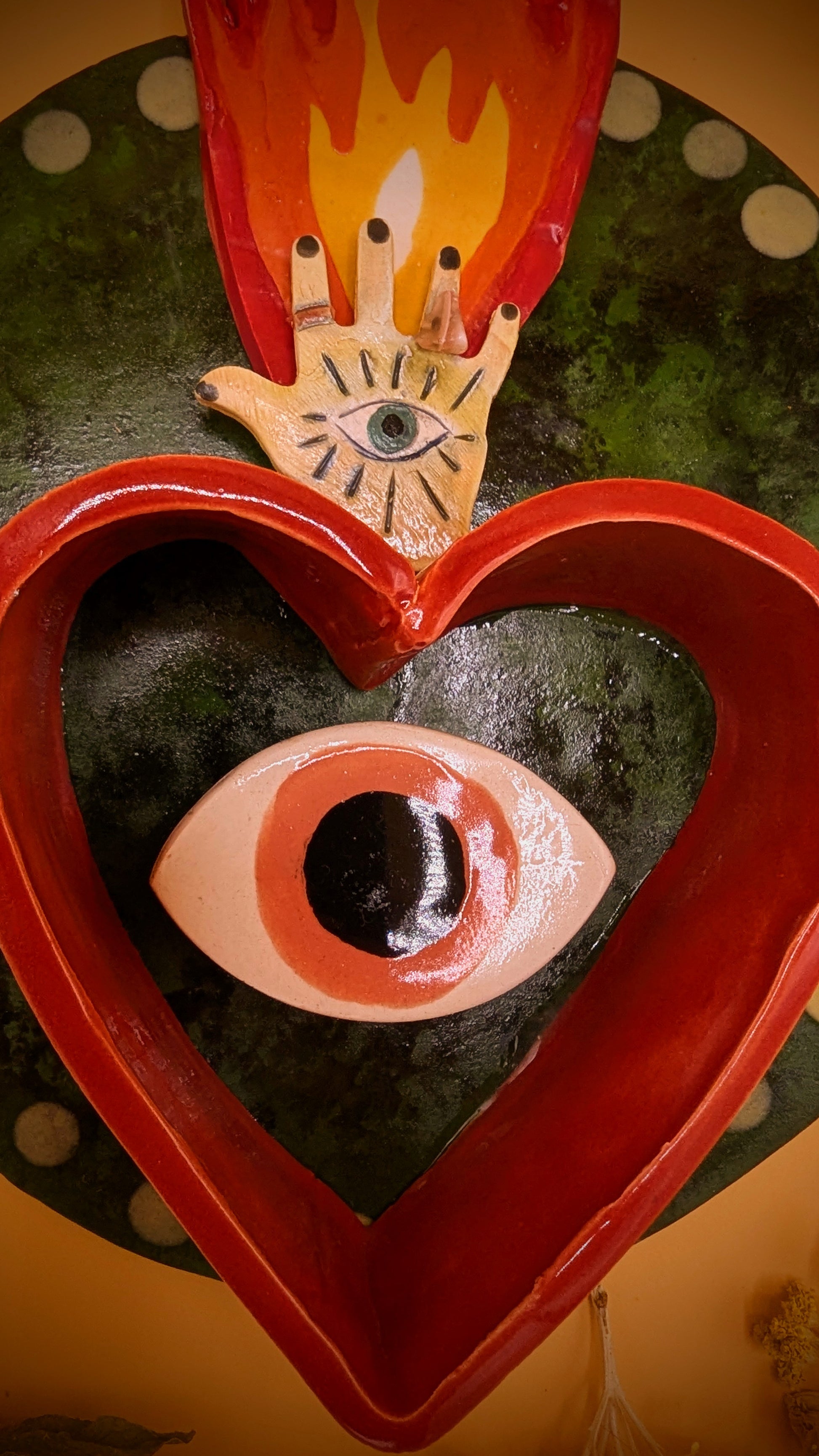 Heart ex voto with hand and flame and heart on green marbled background with dots.