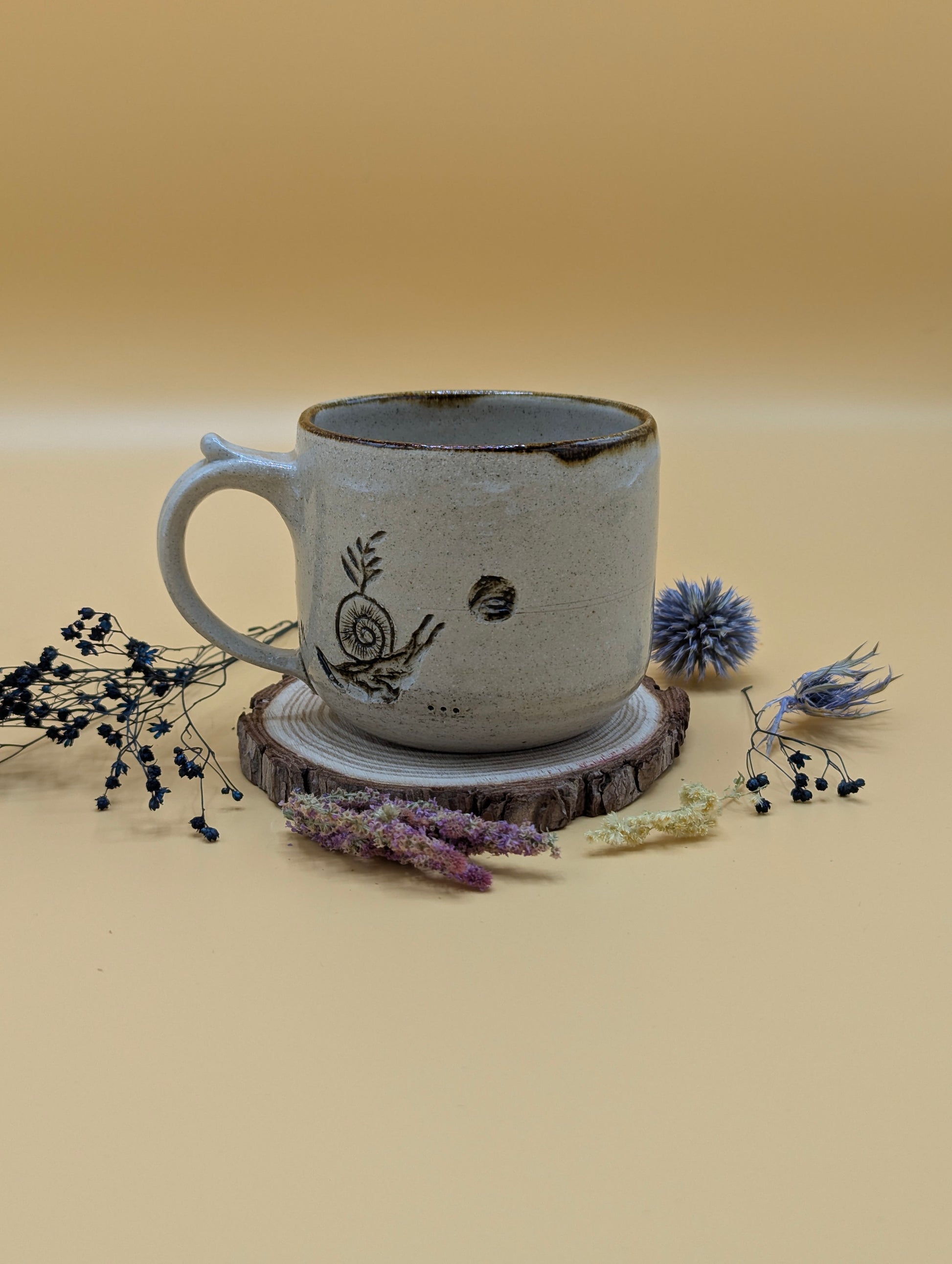 A ceramic mug handmade by Maria Poyato with carved illustrations of snails, ferns and some reflective text.