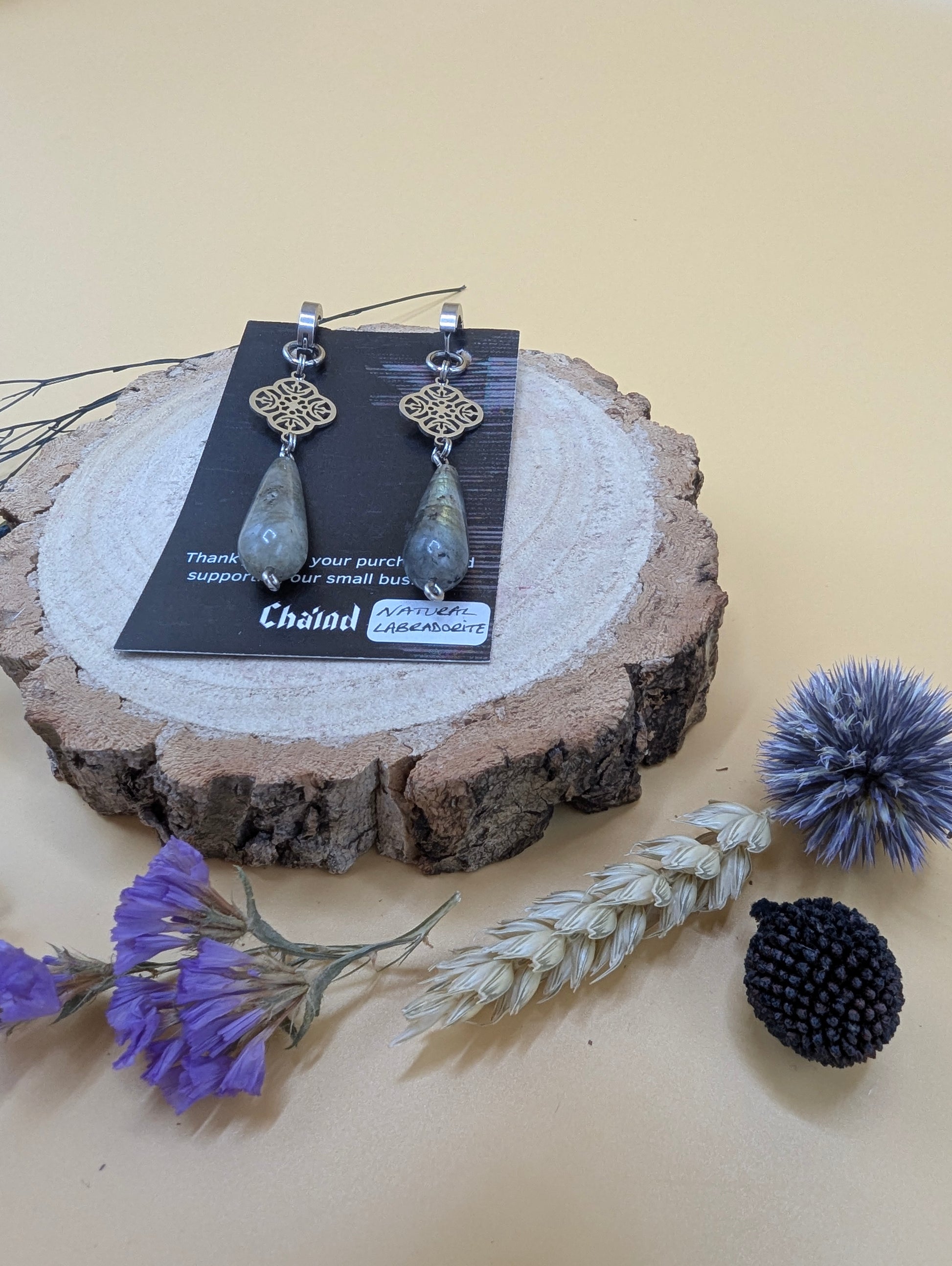 Material: Stainless steel (metal) and natural labradorite(crystal)