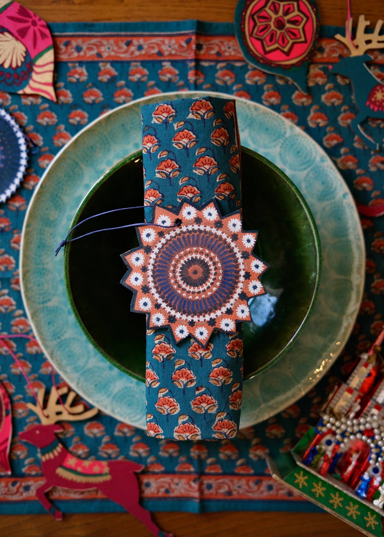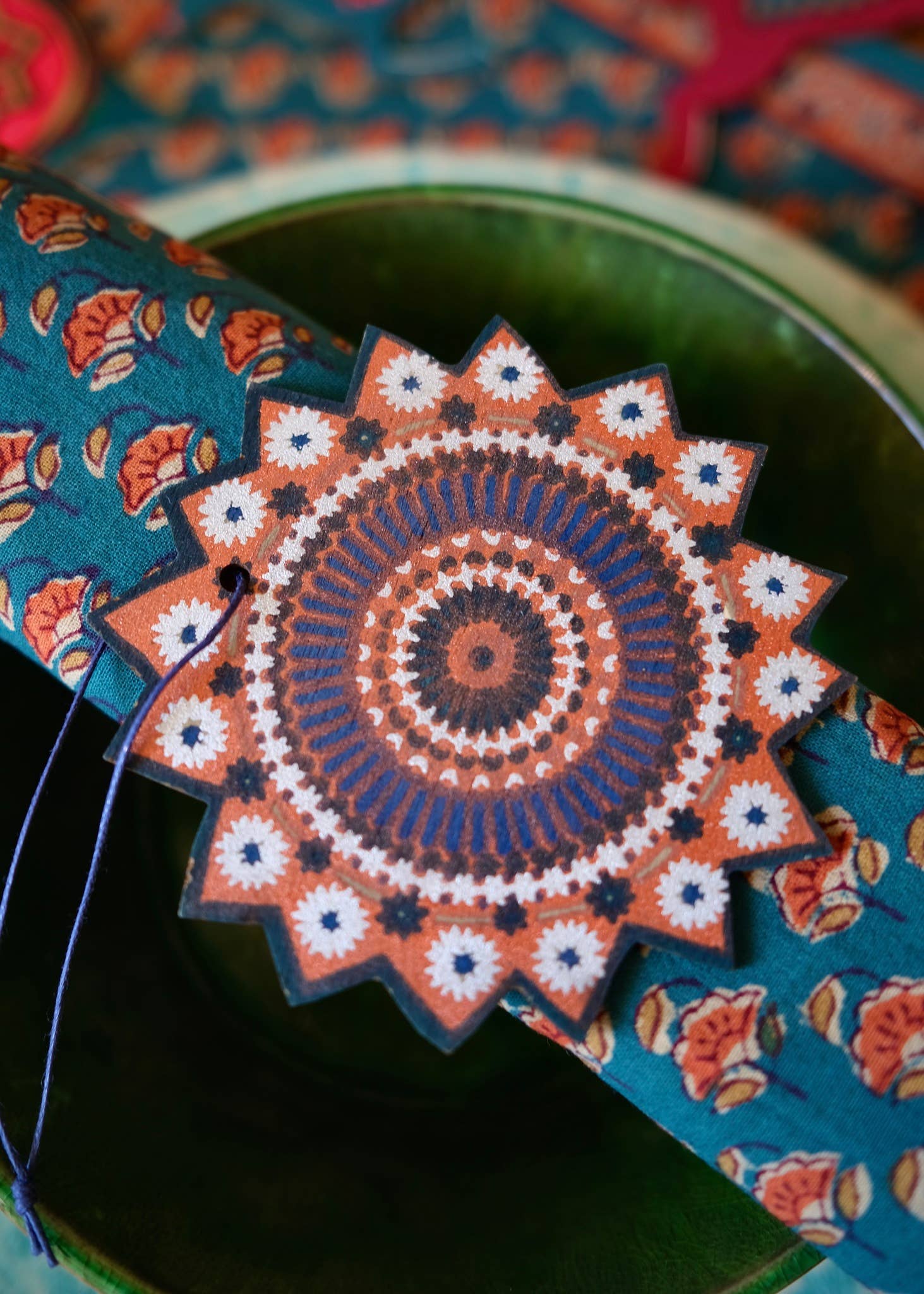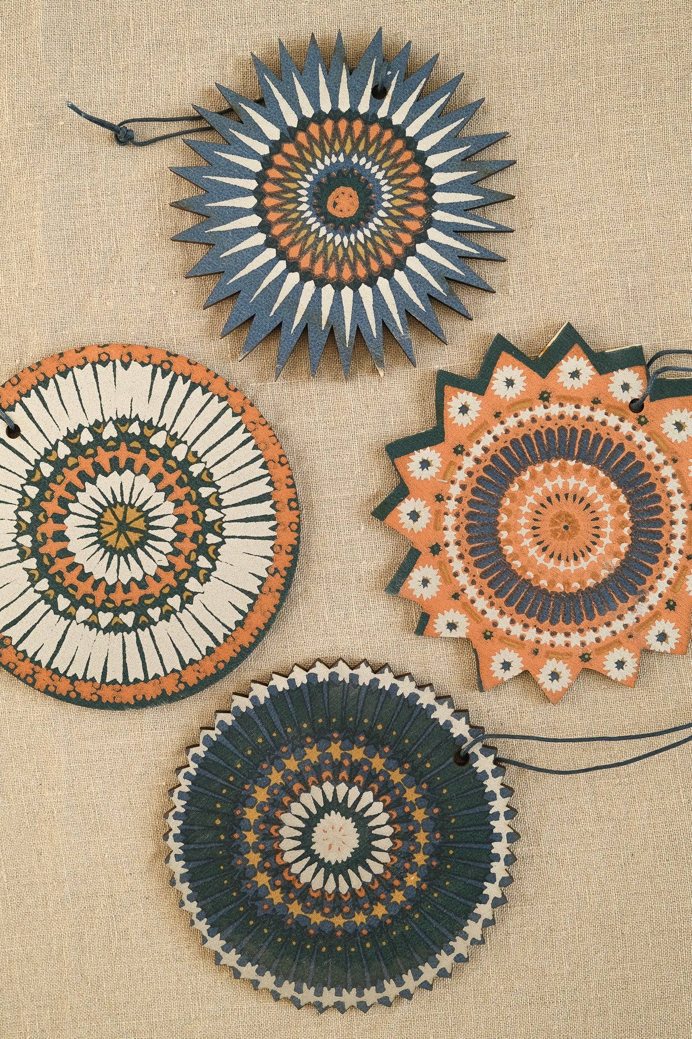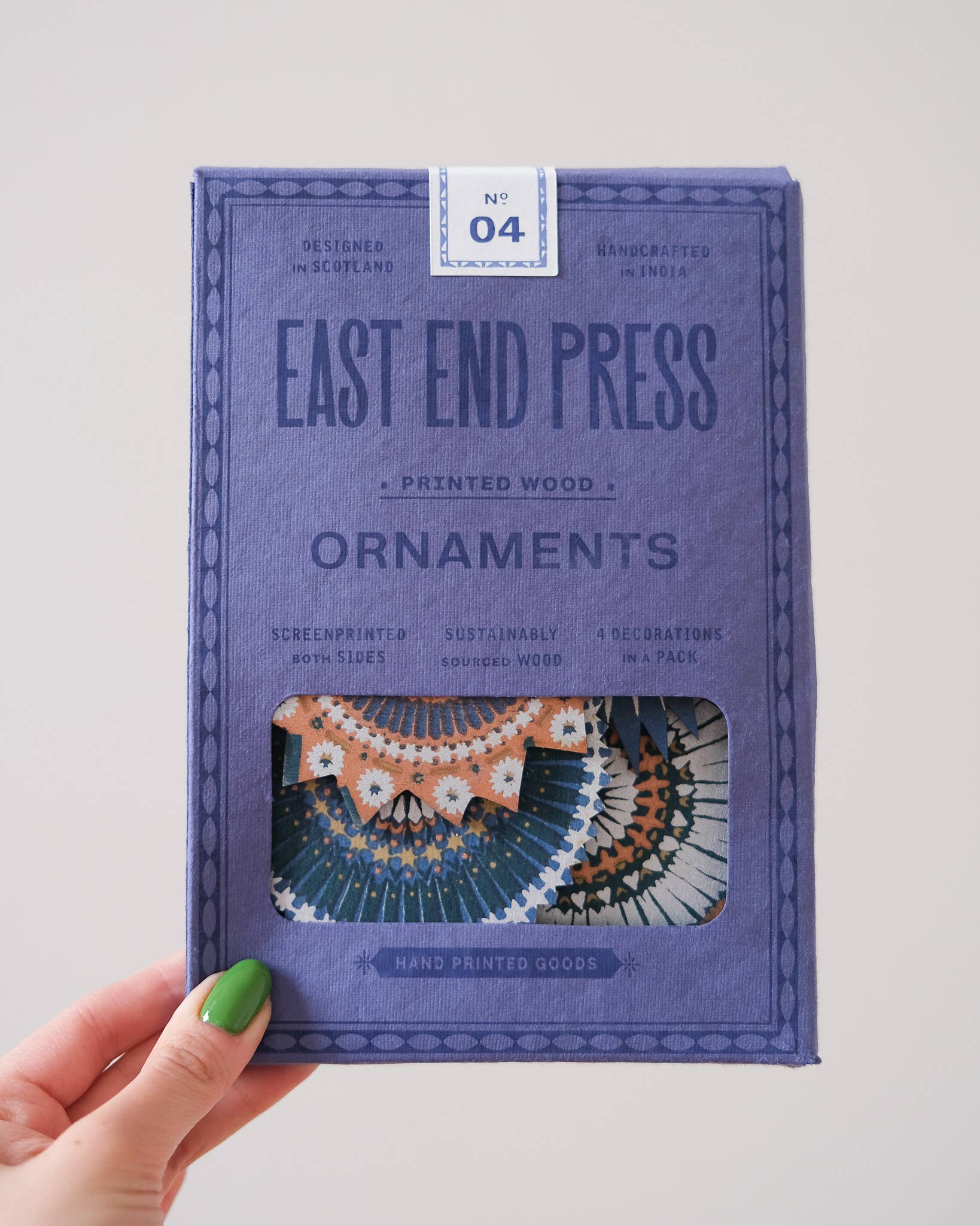 - A set of 4 illustrated wooden decorations with cotton 10cm hanging loop - Screen printed by hand on both sides by talented artisans in Jaipur - Sustainably made from FSC certified plywood.