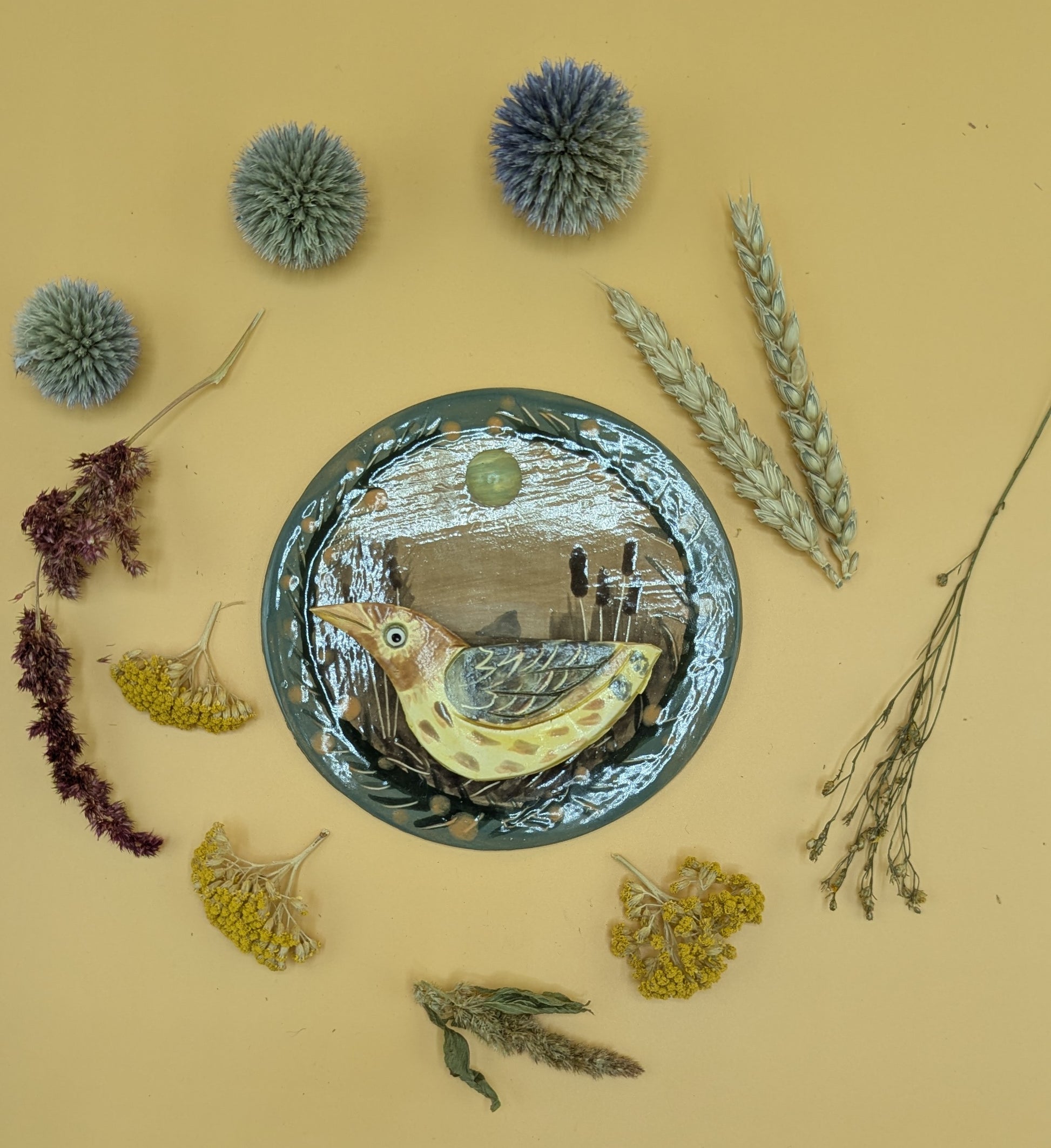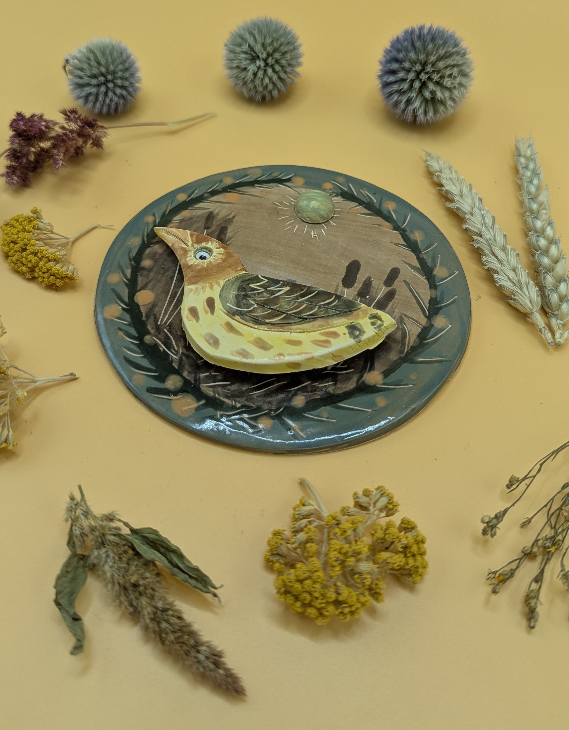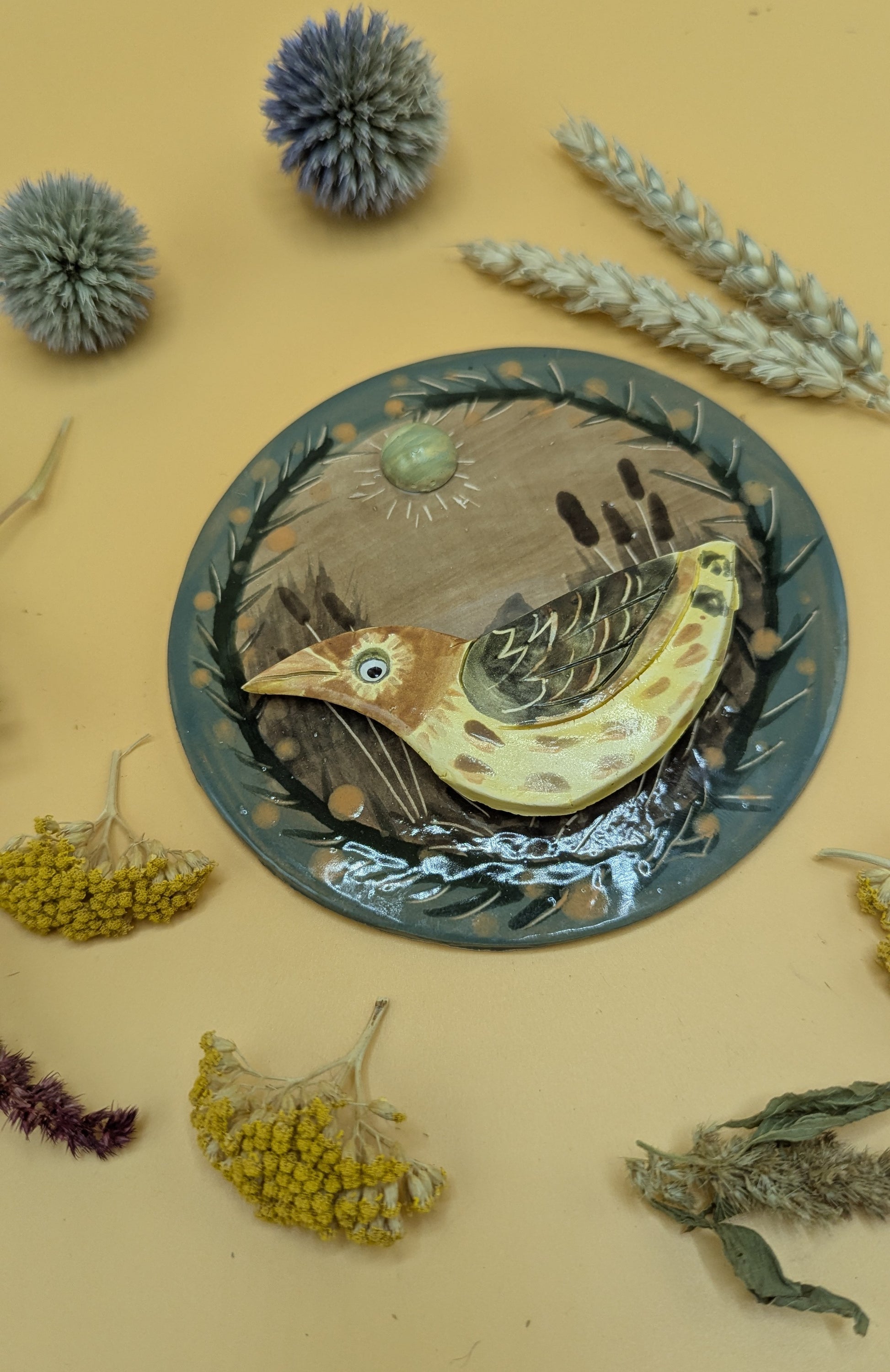 Sunbird is a small circular ceramic plaque with muted tones measuring 12cm across.
