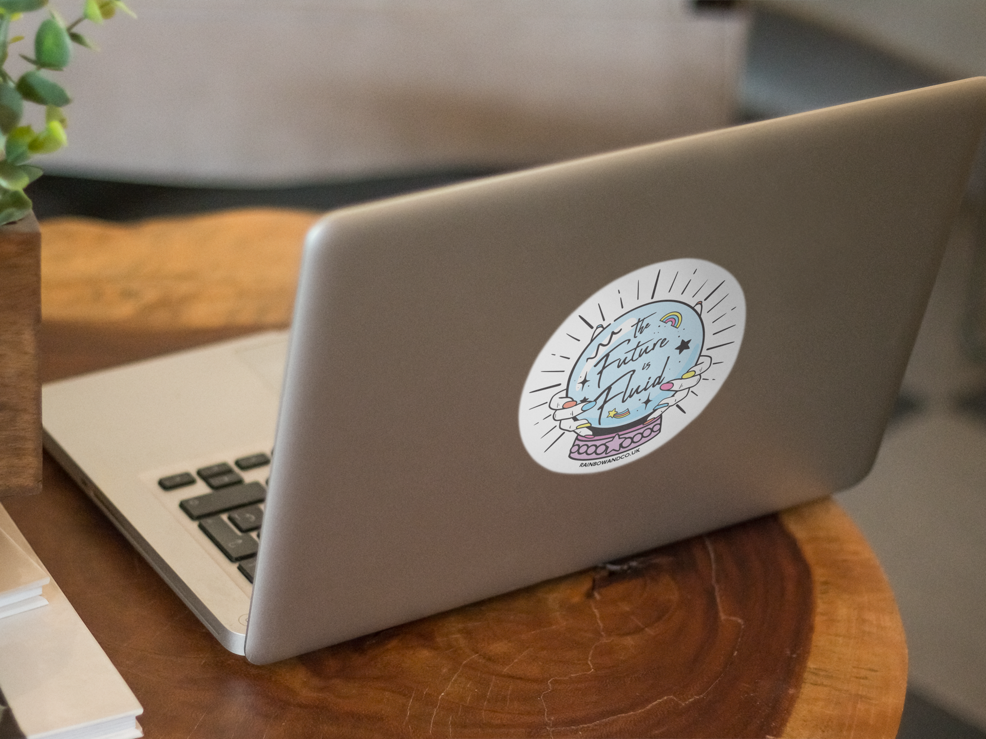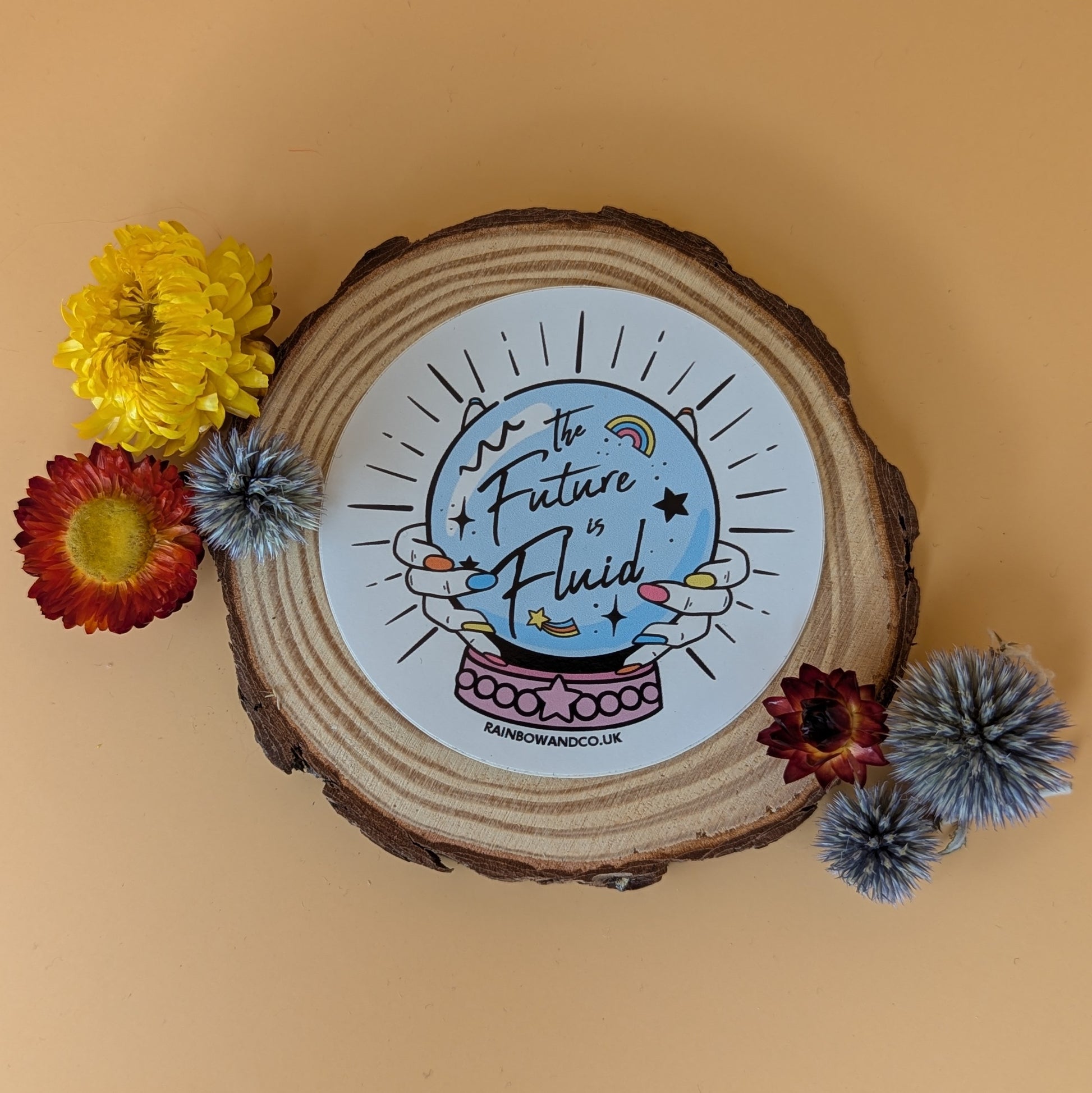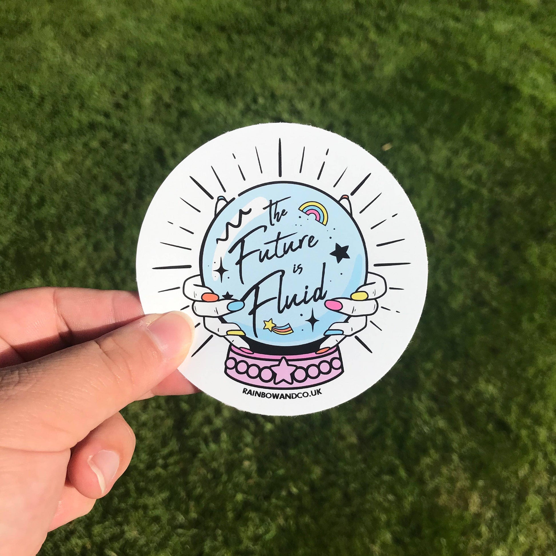 “Durable, full colour, 'The Future is Fluid' vinyl sticker. Jazz up your laptop, notebook, or wall with this fun crystal ball graphic proudly declaring 'The Future is Fluid'! Makes a cute gift for LGBTQ+ folk or anyone who is over the gender binary. Size: approx 8.5cm x 8.5cm”