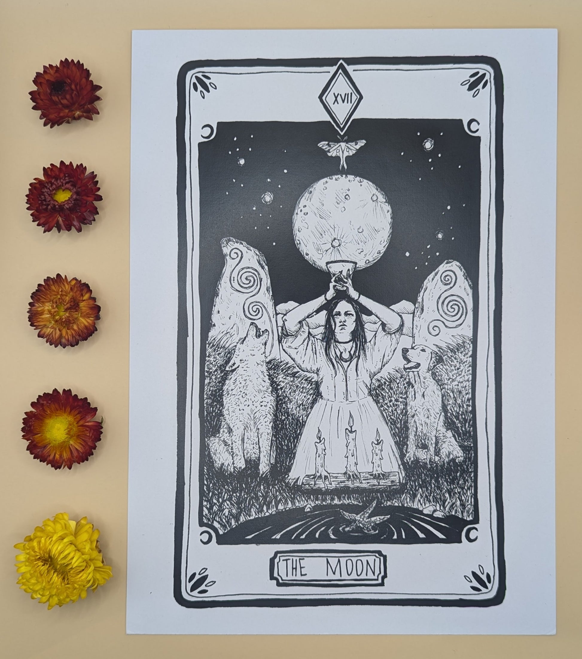 This print features a detailed black and white illustration The Moon card from Katrin Blackwater's illustrated tarot deck.