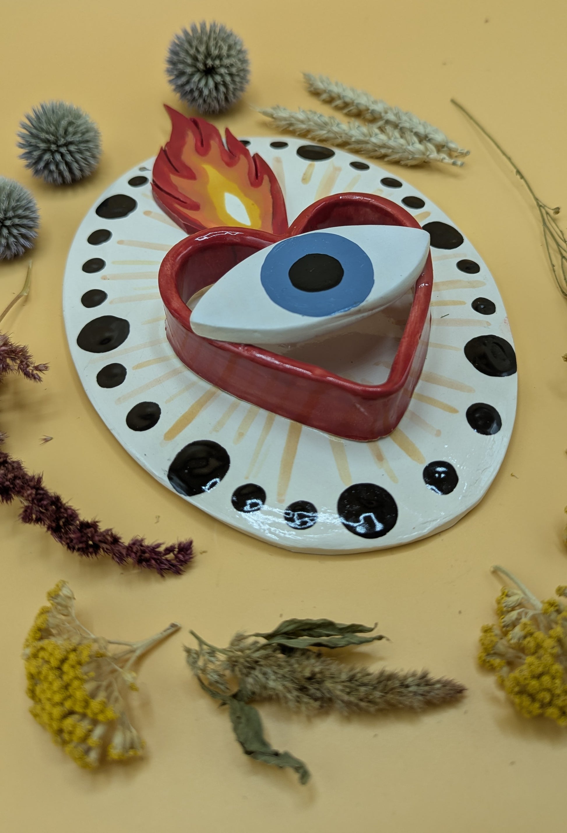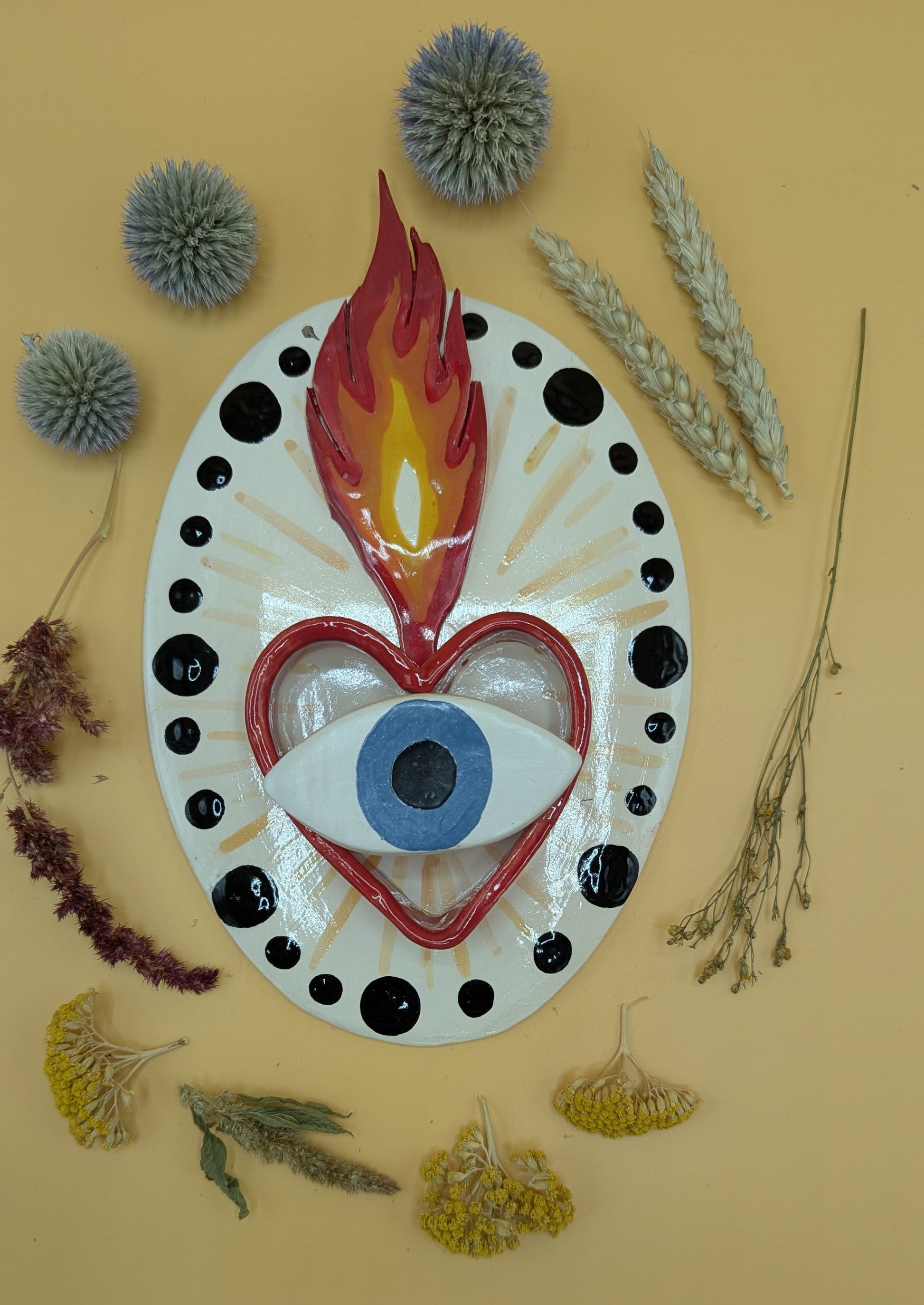 For clarity and confidence. 'Things Will Work Out Right' is an 'ex voto' votive heart on oval plaque with watchful eye and flame. This is a wall-hanging piece with a bold black polka dot border.