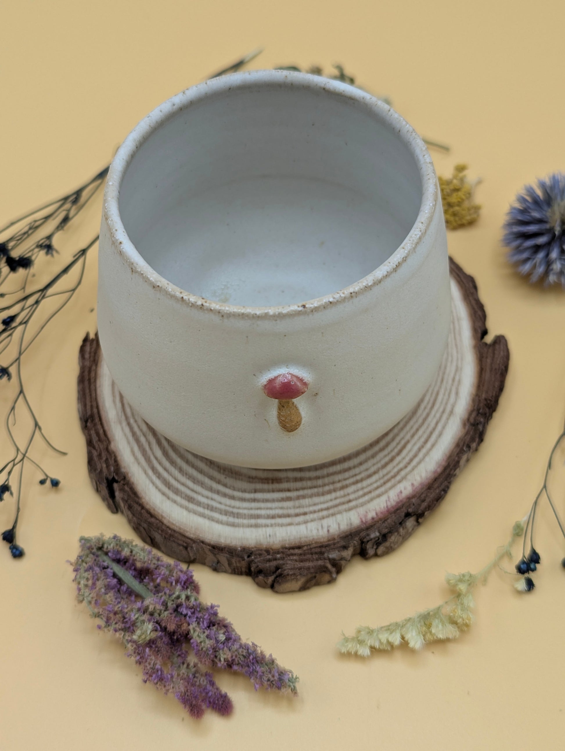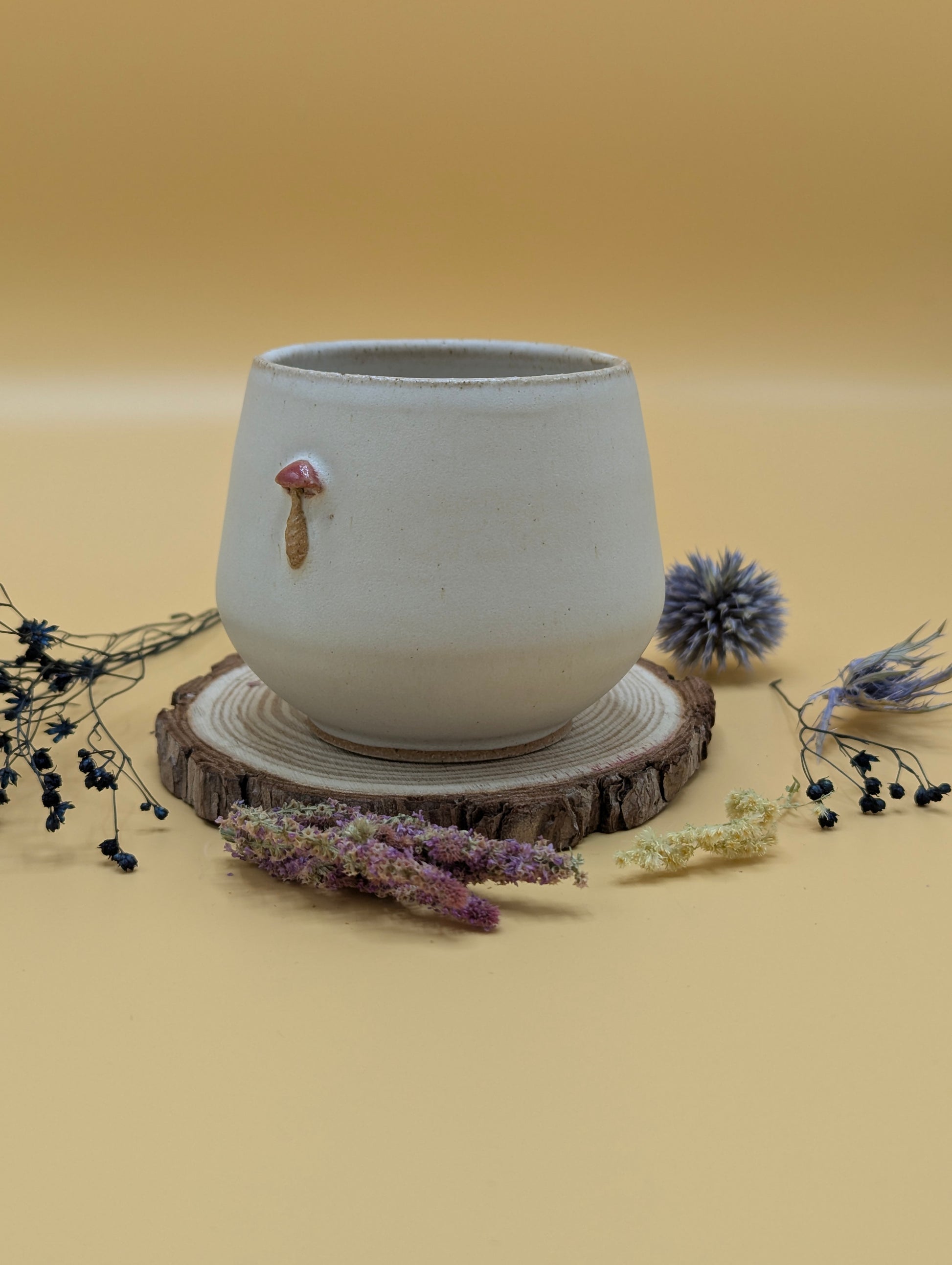 Handmade ceramic cups made by Maria Poyato featuring little mushroom decorations. Perfect for autumnal hot drinks!
